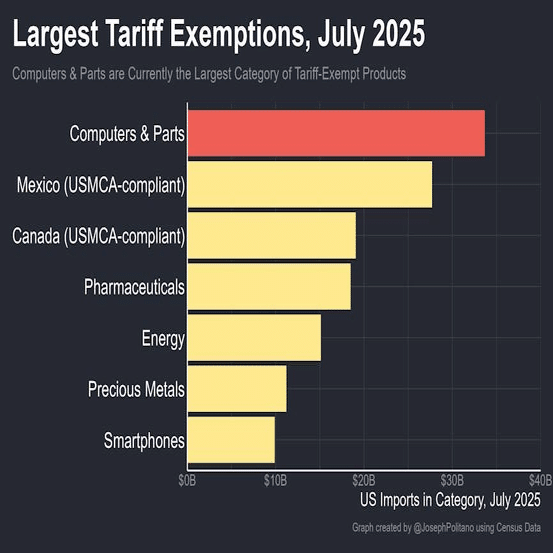 たしかに,AI は金の卵を産むガチョウで保護する値打ちがあるとトランプは思っていそうだ.ジョーイ・ポリターノの指摘によれば,ありとあらゆる産業に関税をかけながらも,トランプは AI とその関連サプライチェーンにはほぼ手を付けていない: