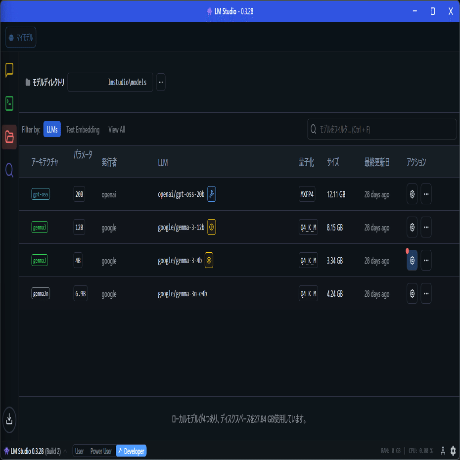 次に、ローカルAIを動作させるLM Studioを準備するよ。基本的なインストールは終了している前提で進めるよ。インストール手順を知りたい人はこっちを見てね。