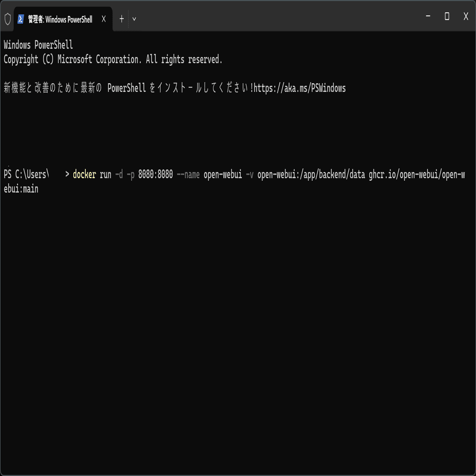 docker run -d -p 8080:8080 --name open-webui -v open-webui:/app/backend/data ghcr.io/open-webui/open-webui:main-p 8080:8080 の部分は、PCの8080番ポートとコンテナの8080番ポートを繋ぐための設定だよ。これをつけないとうまく動かなかったからつけているよ。