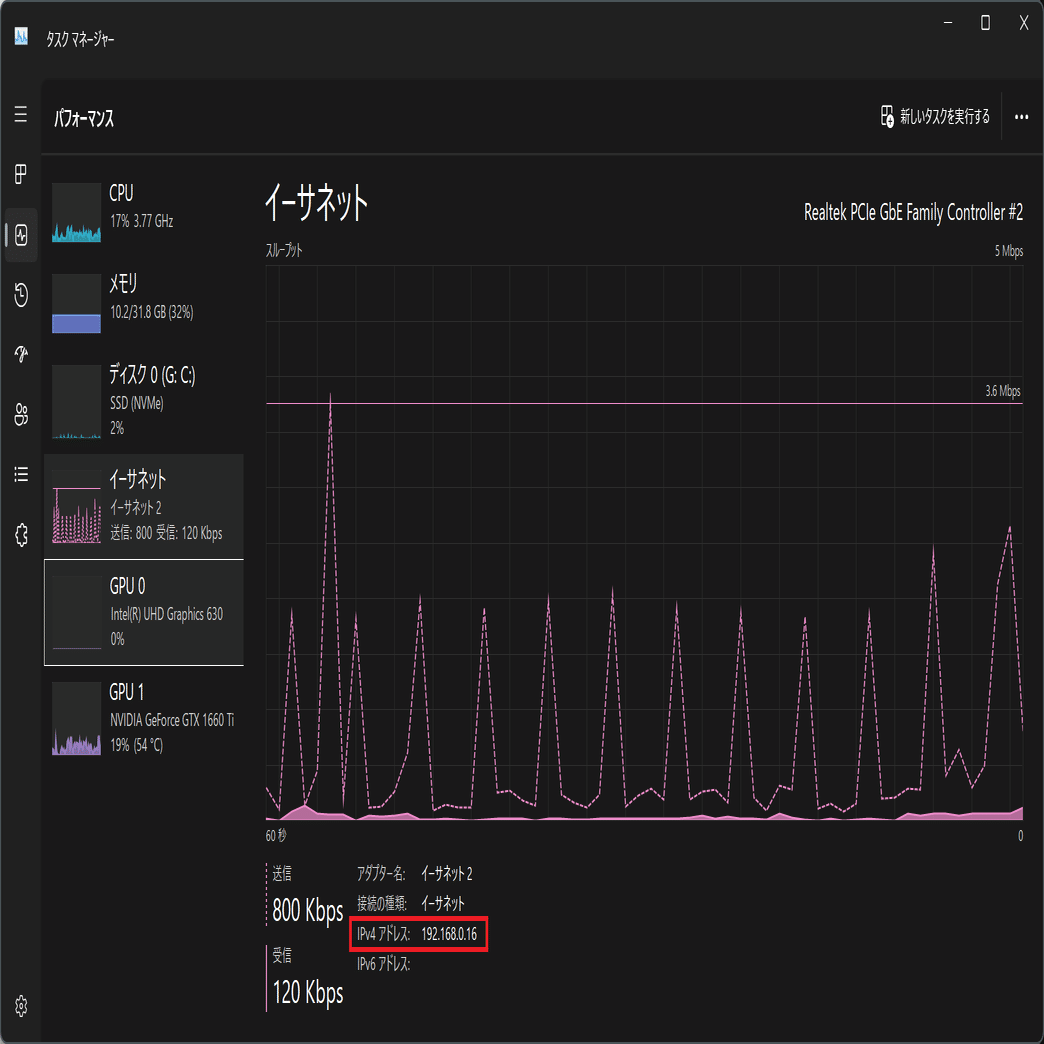 いろいろやり方があるけど、一番簡単なのはタスクマネージャーを開いてネットワークから今のIPアドレスを調べる方法かな?今回だと(192.168.0.16)だね。