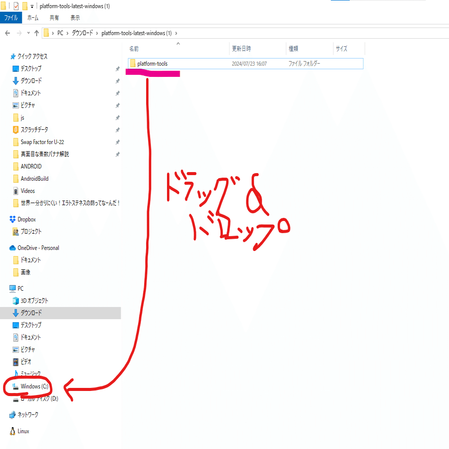 ダウンロードしたらそれを展開し、展開したフォルダをCドライブ