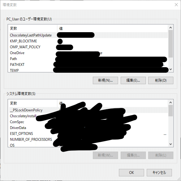 次に検索バーから「環境変数を編集」と検索し出てきたアプリを開いてください。画像のようなものが出てくると思います。