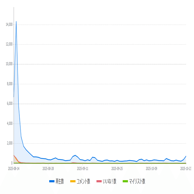 どんな動画もそうだとは思いますが、投稿してから数時間~1日のうちにグワッと伸びて、以降はほぼ平行線でちびちびと数字が増えていきます。