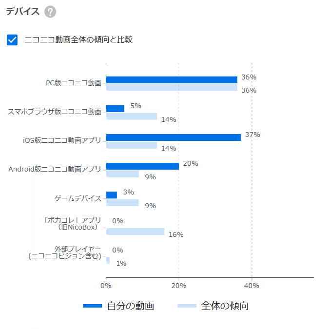 意外だったのが、まだPC版ニコニコで見ている人が多いという事。淫夢動画は大体規制されているのでまだ分かりますが、ニコニコ全体でもそういう傾向があるとは思ってませんでした。あと全体と比べてスマホの動画アプリで見ている人が倍以上多い事。もしかしたらスマホアプリの方がデバイス制限された動画も見やすいんでしょうか。