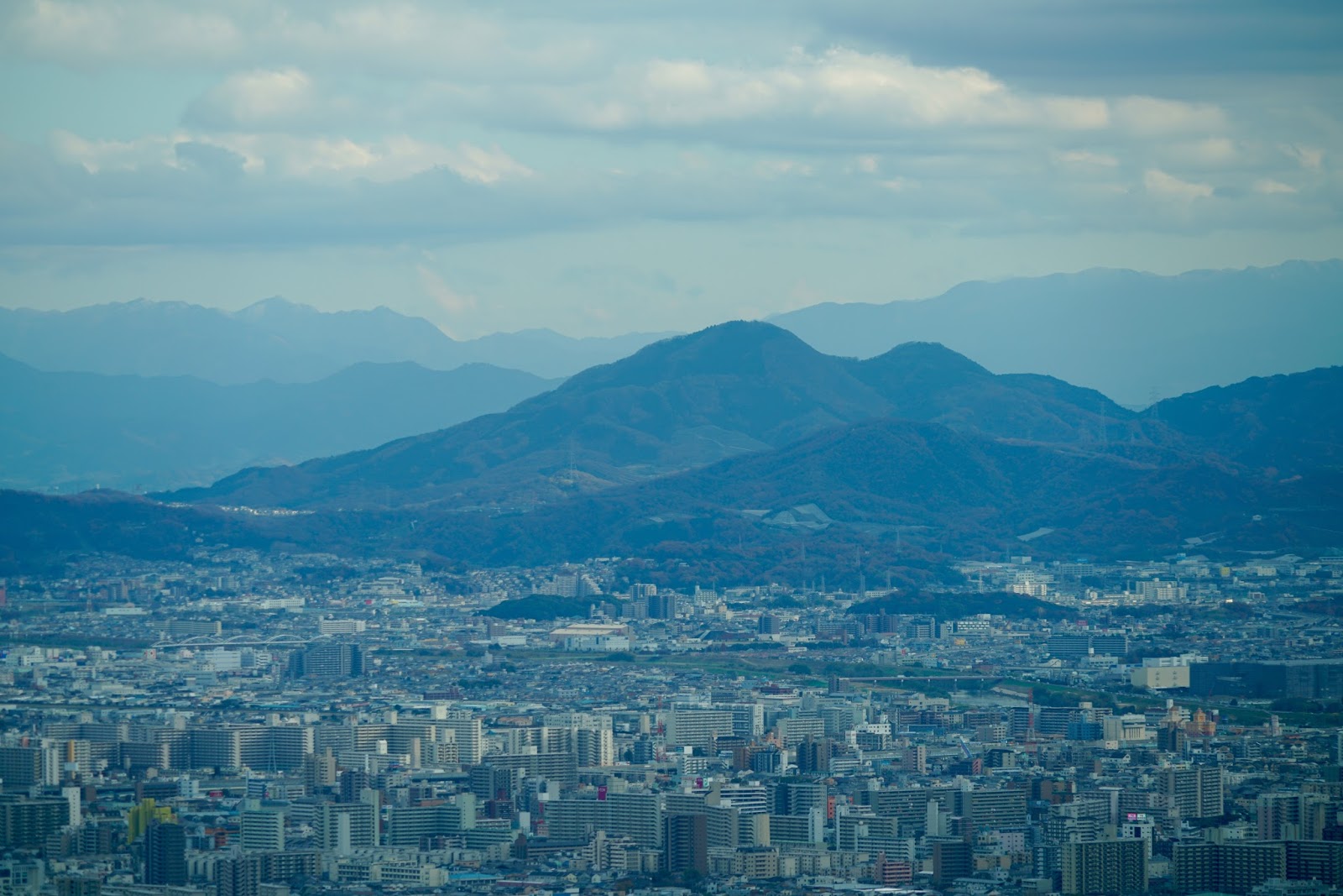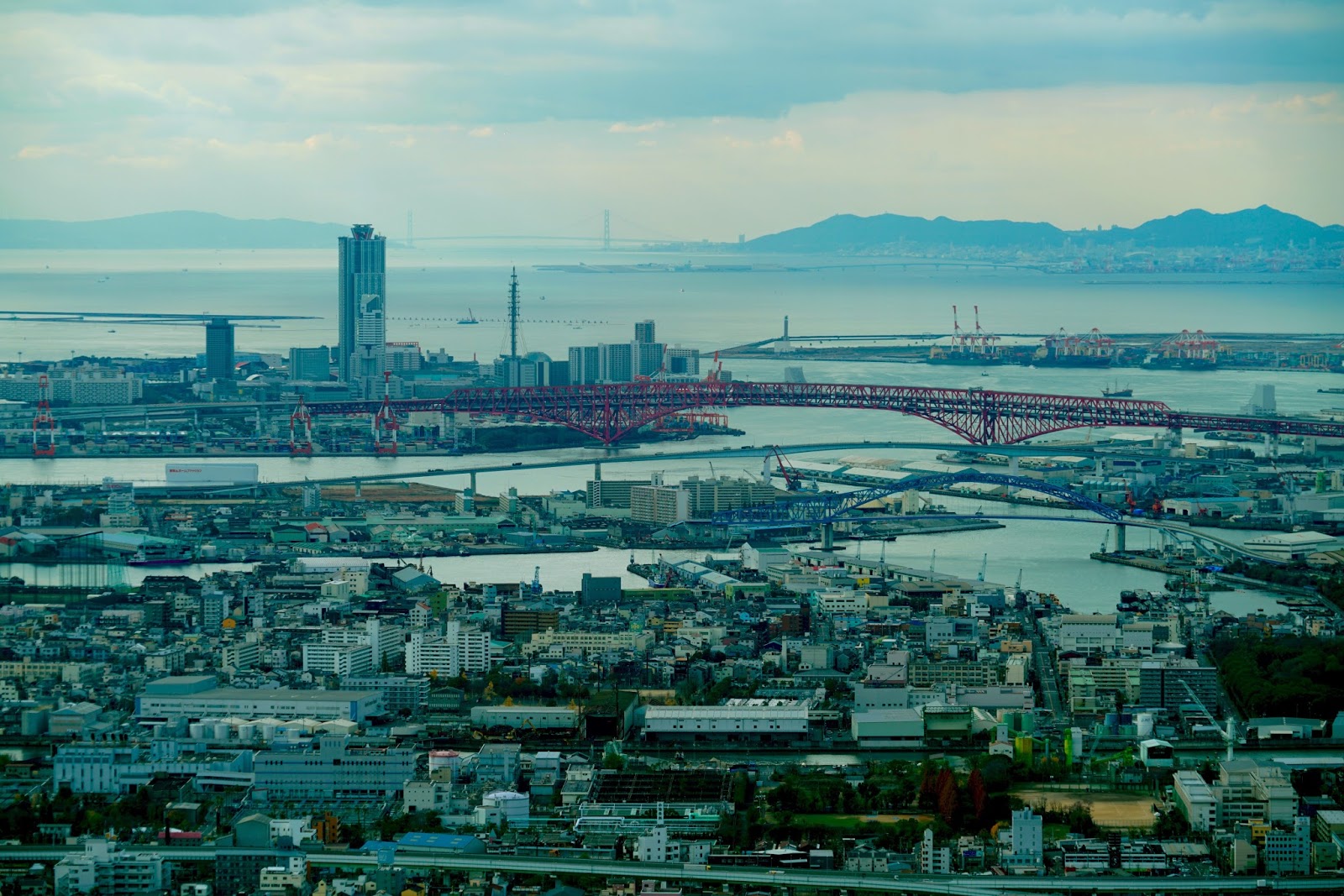 西方向、大阪市街地を隔てて大阪湾、さらには明石海峡大橋、淡路島が遠く見える |