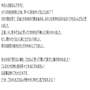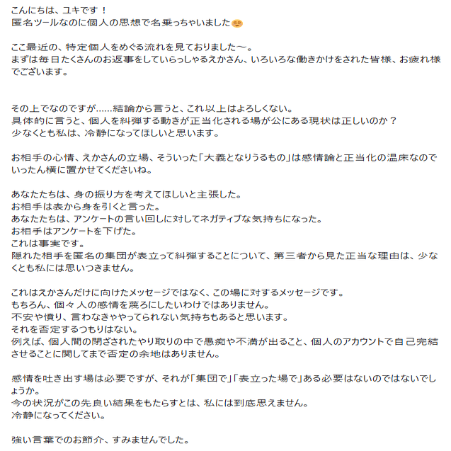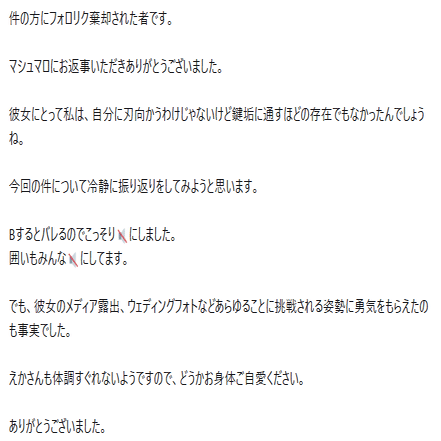 結果何があったかは知らないけどアンケートは取り下げ。そして彼女へのお気持ちがみんな爆発してここにいろいろ話が出てくるようになった。