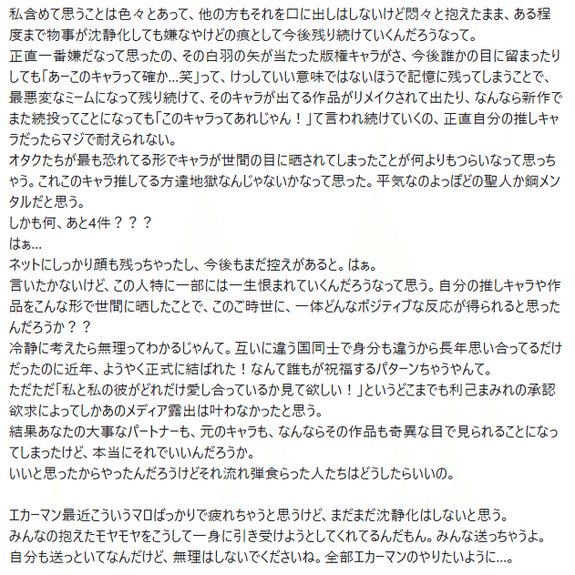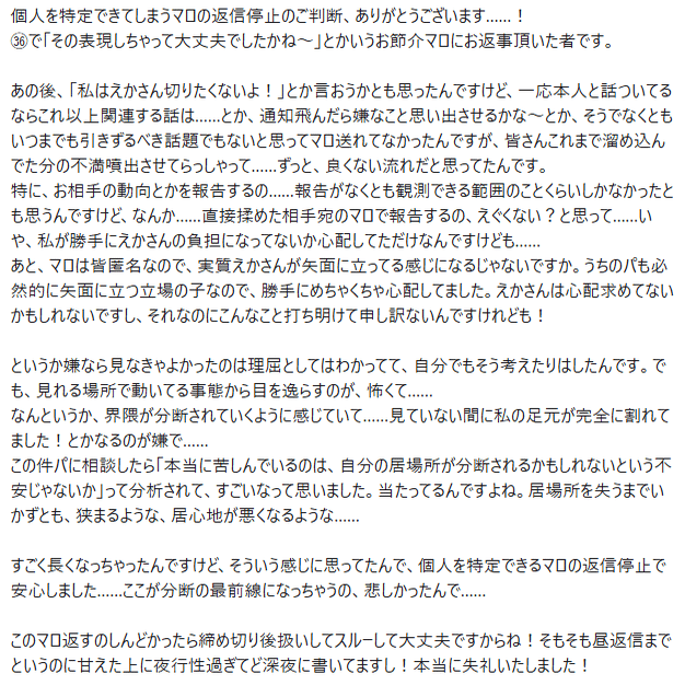 先にかいとくね!ユキちゃんのこのマロがきっかけで私は昨日のお気持ちを表明するに至りました。で、それはわたしがきめたことね。で、オープンな場でお話してるので、私のリプをたどればやり取りは見れますでも、ユキちゃんにDMとかで酷いこととか、なんであんなこと言ったのみたいなのは控えてほしいです。これはエカーマンからのお願いだよ。
