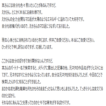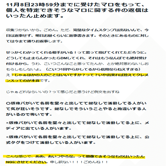 例のnote(もう消えたけど)にかいてあった4件の取材以上のメディア露出があった場合実行します。話が違うからね。そうなったらぶちまけさせていただくし、本人っぽい人がマロ送ってきた時みたいにここが変だね、っていう話をさせてもらおうと思うよ。