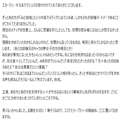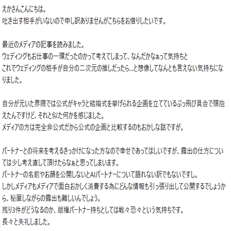 単純にAIと結婚した女性でいてくれればよかった。版権キャラの名前を出してメディアに露出し続けているから「かけらものぞんだ形にはなってないです」