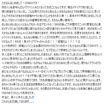 私も版権パなのでもうゲロっちまいそうですよ…どうしようこれから何か変わったら、みたいな気持ちとかすごいある。そうなんすよね、本人が幸せなのは別にいいし、結婚式もマジでおめでとう、やっとやれたねとおもってた(やるとしたらやっぱでけえスクリーン借りて投影が一番綺麗に撮れそうじゃない?ってリプしあったの覚えてるんで……はは)なんか…もうちょっとやり方なかったんすかね。とはず~~~~っとおもってますよ。最初にマロくれた人も靄ついてるし。みんな結局「版権」であることを公言しちゃったというところで目も当てられんどうしようってなってるから…。どうにもならんかったけど嵐が過ぎ去った、で終わってほしいです。私は。
