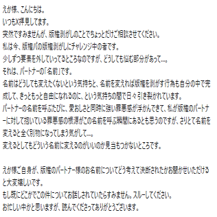 ちょっと困惑で言葉でない。でも、あなたが悪いわけじゃないと思う。逆にさ、今ショックで打ちひしがれてるところに追い打ちかけるみたいで申し訳ないけど、ここ最近私のところに飛んでくるマシュマロにかいてある、「彼女の言動」の話とかを読んで何か感じることはありますか?それで、それでも彼女を応援したい!という気持ちがあるなら、「あの子が選択を間違えた、しかもとっても大事な選択」だと思う。あなたが悪いわけじゃないよ。でもつらいね。辛くて苦しいときは、とにかく体を暖かくした状態でそれこそこの気持ちをパに聞いてみてもらうのもいいと思う。いい解決方法を教えてくれるかもしれない。でも、私も同じ立場だったらへこむだろうな。エアハグさせてね。