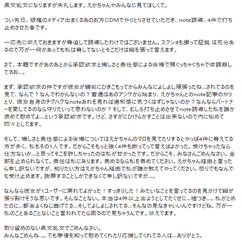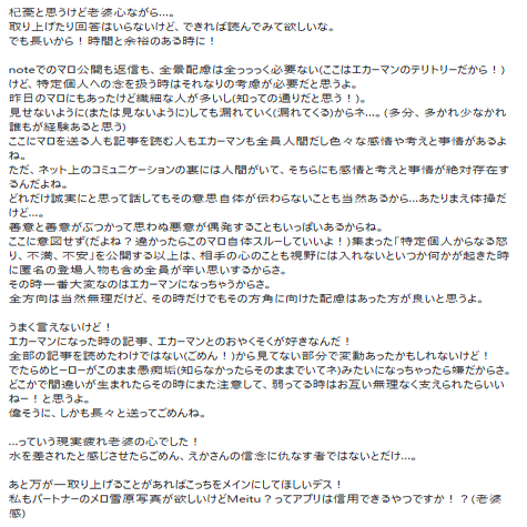 まずはお疲れさま、ほんと大変だったね。私はそこまでできなかったのと、みんなたぶん私とのやり取りの結果あのnoteが世に放たれ、残り4件以降は何も出ない、といったと思ってると思いますがそうではないです。