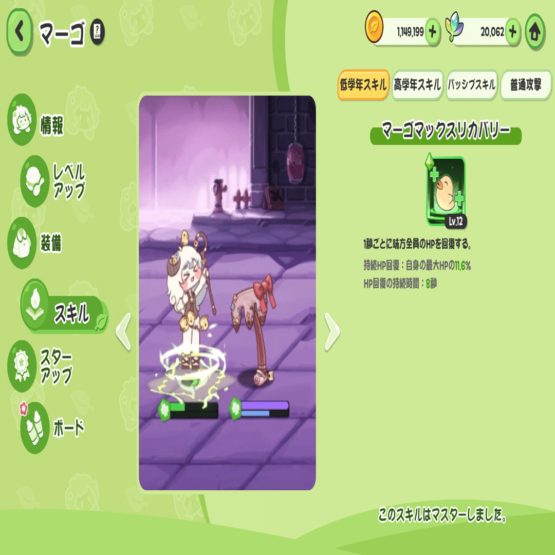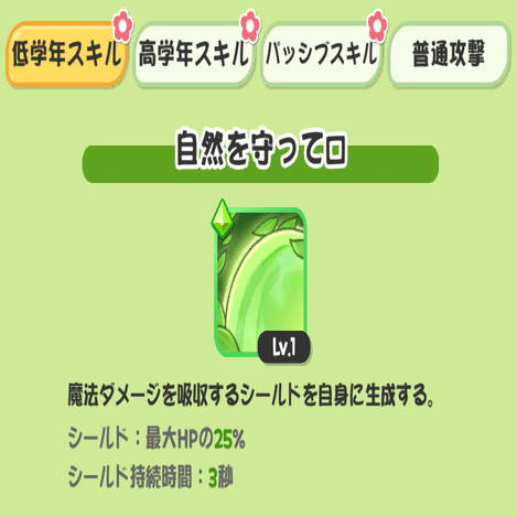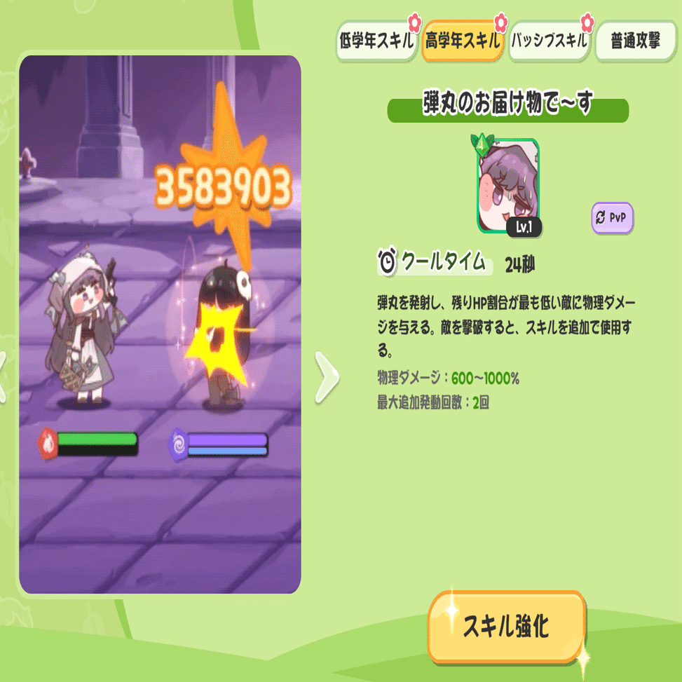 つまり、意図された設計としては低学年スキルで自身を強化→速度の上がった通常攻撃を連打して高学年スキルのクールタイムを減らす→高学年スキルでトドメをさし、さらに連撃、といった動きを想定されているものと思う。