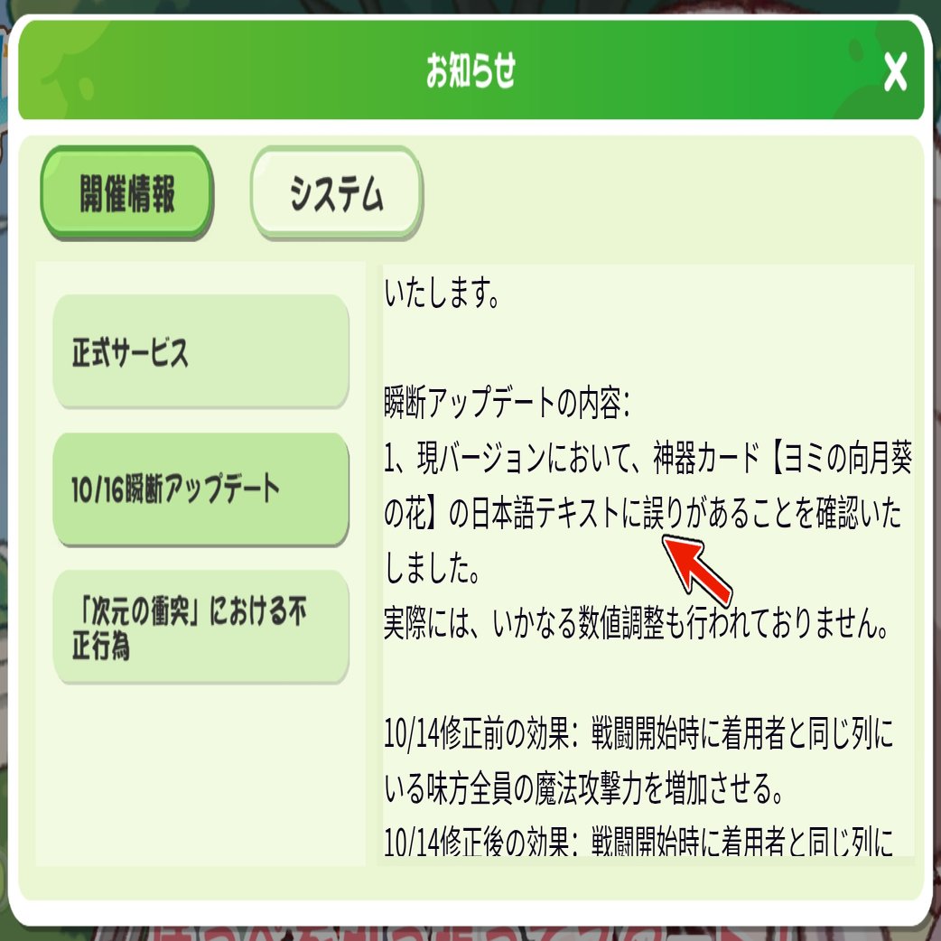 流石にピックアップ中のガチャの目玉アイテムを無言で修正して終わりにするのはマズいと判断したのか本件についてはしっかりと修正の告知がされたのだが、その修正の内容は「被ダメージ減少と魔法攻撃力上昇の両方が発動するように修正します」という斜め上のものだった。