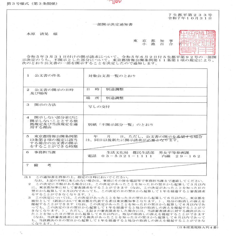 えー、2年以上裁判であらそって、公約の「のり弁をやめます」を削除して黒塗りにして出した都知事小池百合子の書面の下がもう1件開示されましたね