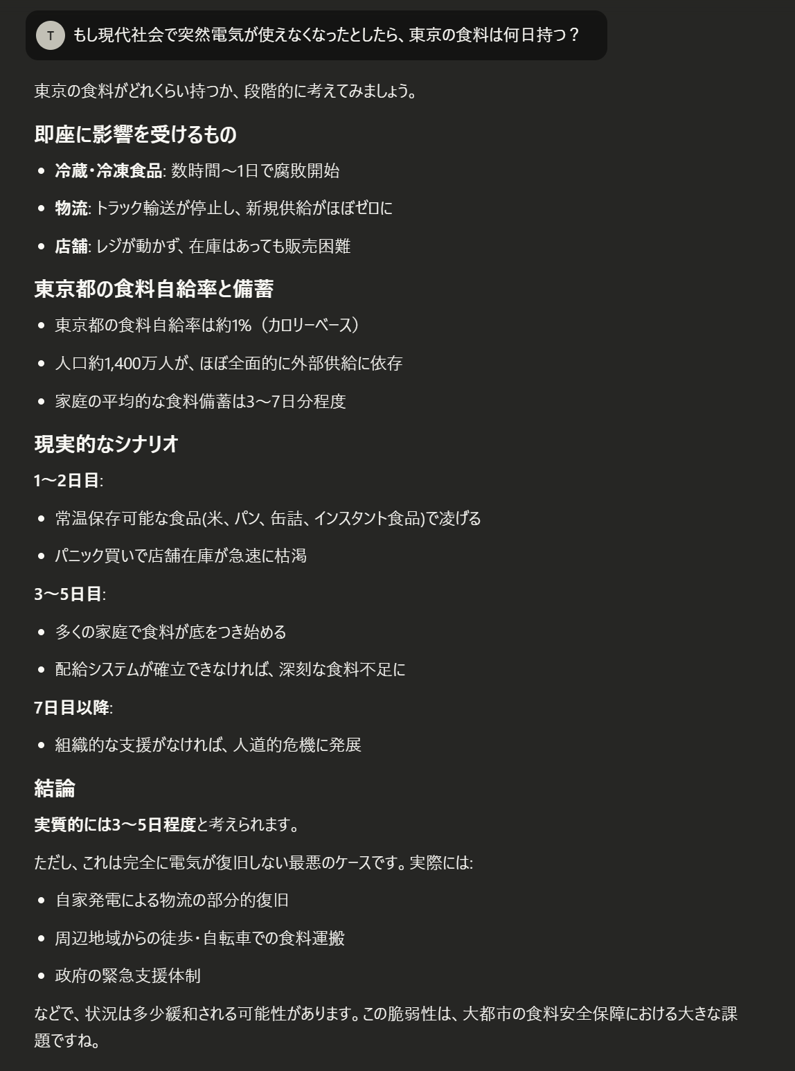 たーびん@ノベルスキー管理人@tar_bin4d ago例は適当だったけどこんな感じで返ってくる。追加で「じゃあ△△だと仮定したら?」みたいにつなげるとけっこう考え方の勉強になるしおもしろい。数値の正確さより考え方とか連想としてどんな用語が出てくるかのほうが役に立つかも。たーびん@ノベルスキー管理人@tar_bin4d ago例:「もし現代社会で突然電気が使えなくなったとしたら、東京の食料は何日持つ?」こういうの正解が欲しいわけではなくフェルミ推定的な推論過程の例が欲しいだけ。 かるた分室1