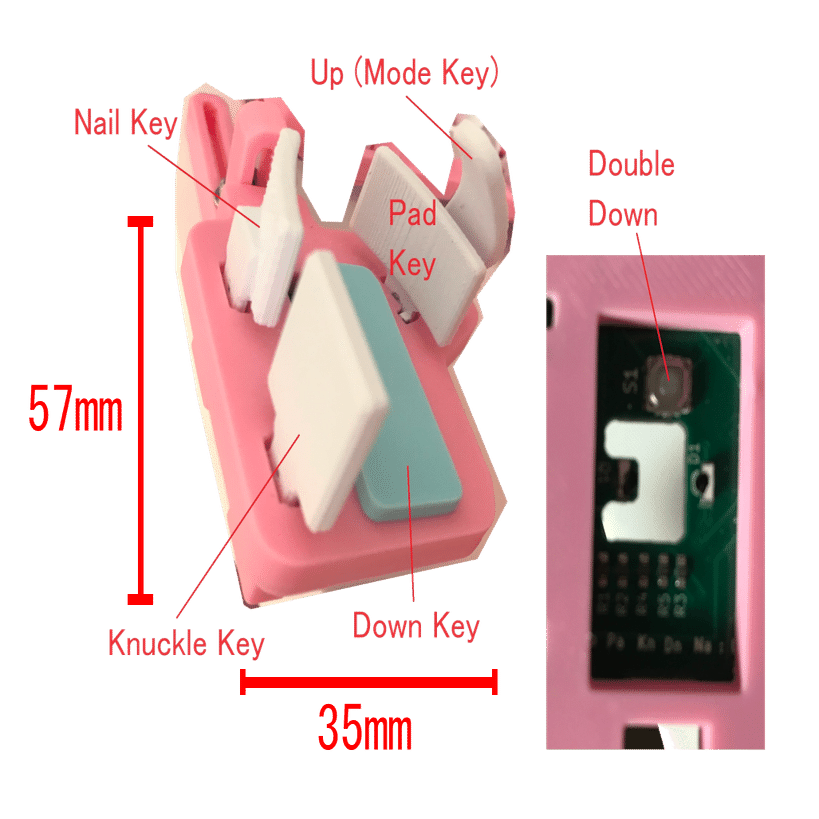 フィンガークラスターのCキーとサムクラスターのDownキー以外で、もう少し入力判定を深くしたい場合は、キーのL字部分にマスキングテープを1枚から2枚貼ってみてください。