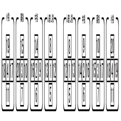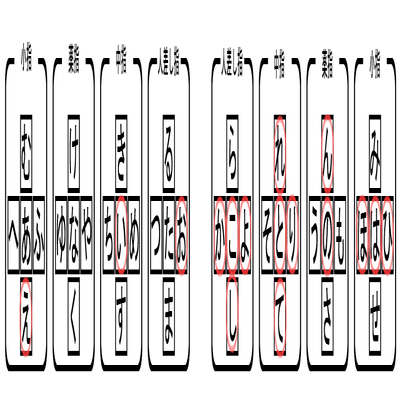 右手側は「っ」「れ」「ん」「を」「か(が)」「こ(ご)」「よ(ょ)」「と(ど)」「り」「の」「に」「ほ(ぼ、ぽ)」「は(ば、ぱ)」「ひ(び、ぴ)」「し(じ)」「て(で)」