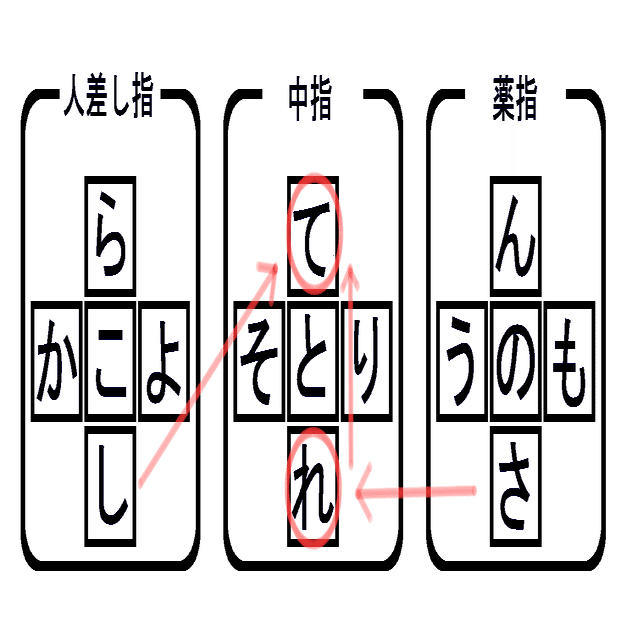 右手「り」の長押しに何も入れていないので、ここに「む」を入れて漢字の「無理」「向かう」「読む」などの組み合わせを重視するのも良いと思います。