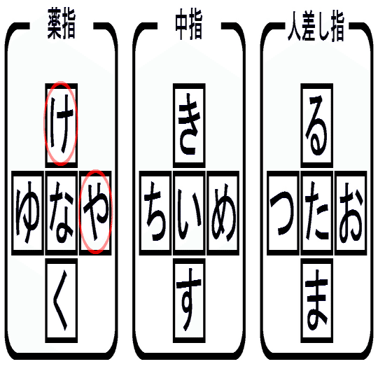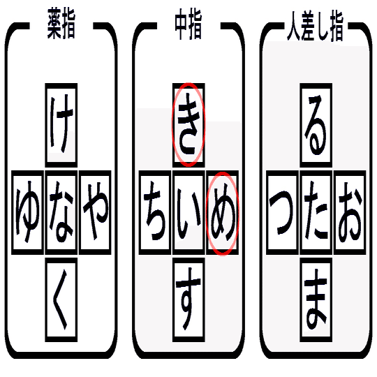 左手中指の「き」と「め」の関係に近いですね。と言っても、こちらは運指に問題があったわけではなくて、単純に「け」と「や」を逆にしたほうが気持ちよく打てそうだと思ったからです。