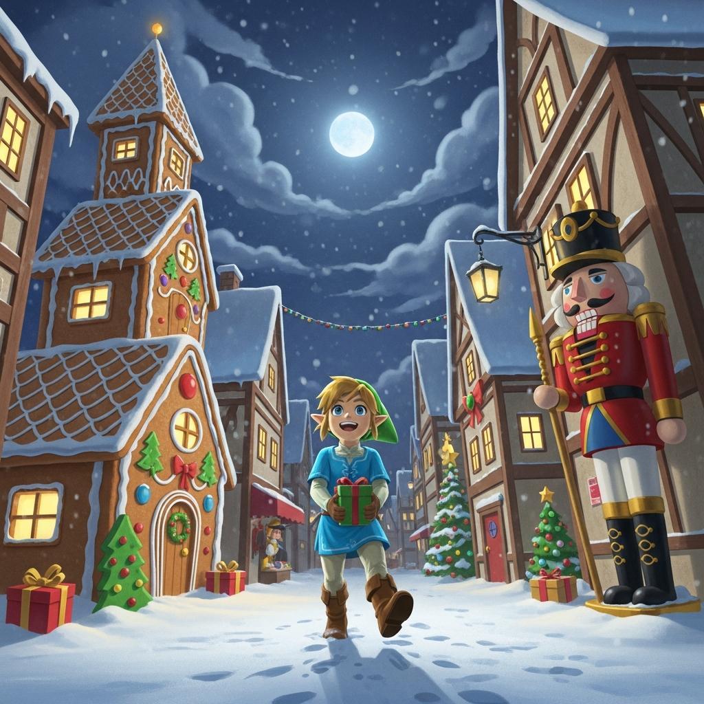 {Link from The Legend of Zelda, joyfully exploring a festive Christmas town} illustrated in the illustrative realism art style of Chris Van Allsburg (1949-), which is a sculptural chiaroscuro with an engineered perspective disorientation through an optical illusion-like visual angle rendered in photoreal tonal modeling within a seamlessly blended modernist framework: {