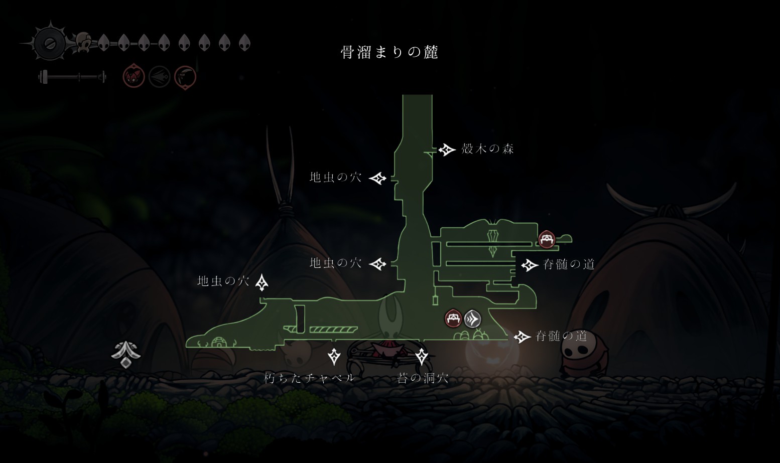新たな目的地が表示されるので、骨溜まりの麓から骨の墓所に向かうと左奥に洞窟が追加されている。