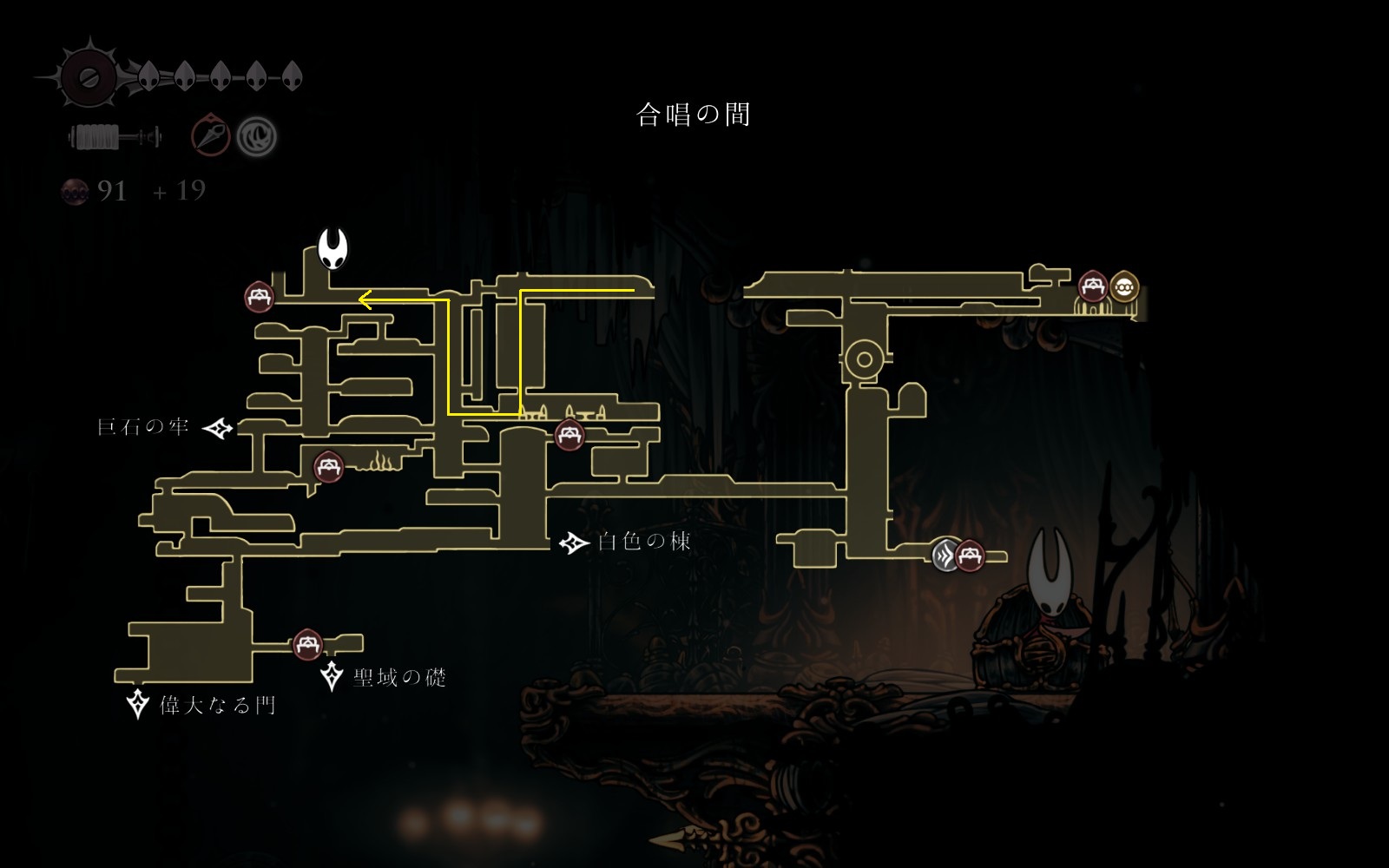 ※仮面の破片や糸巻の破片は無視(もし地中の穴、囁きの貯蔵庫、ペブの店の仮面の破片を入手してライフ7を目指すなら取りにいく)
