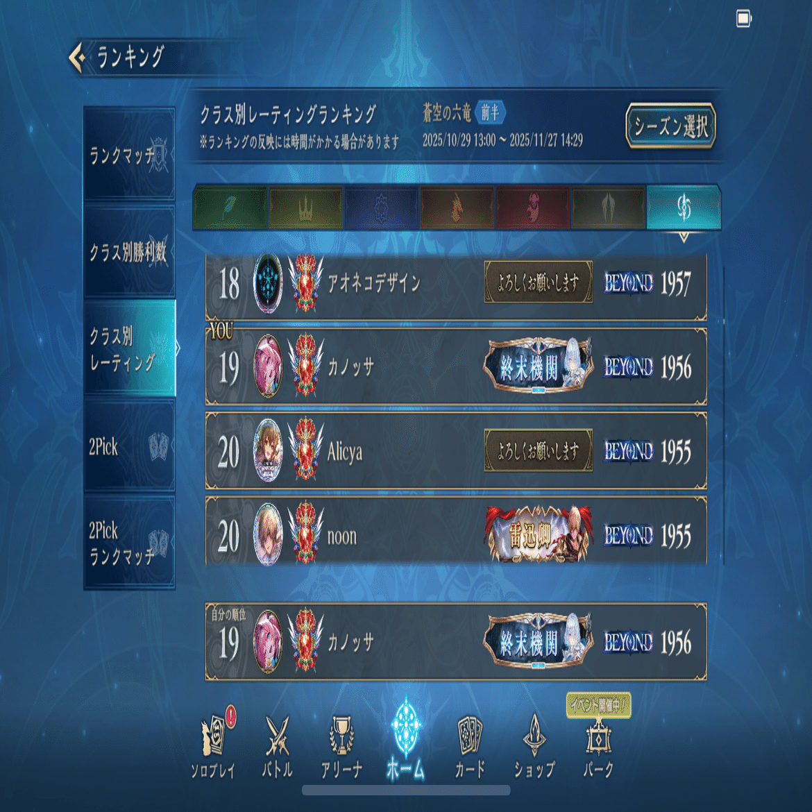 現在のレートは1956で19位と中々いい感じです。前回の記事の構築からより洗練されたリストにもなってきたし進化ドラなど新しいデッキタイプも出てきてメタが変化していくこの環境とても面白くシャドバも良いゲームになったなと思うばかりです。