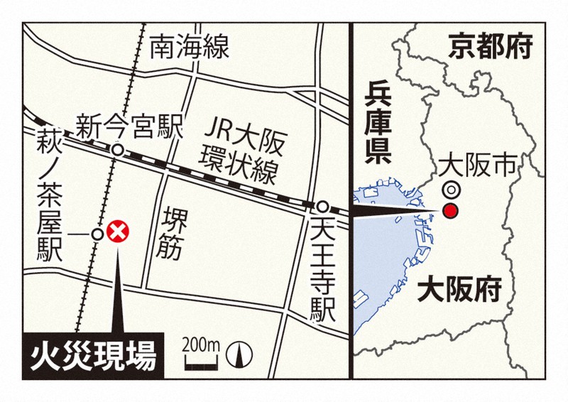 現場は南海電鉄・萩ノ茶屋駅から東に約80メートルの住宅や飲食店が並ぶ商店街の一角にある。【露木陽介、松原隼斗、大坪菜々美】