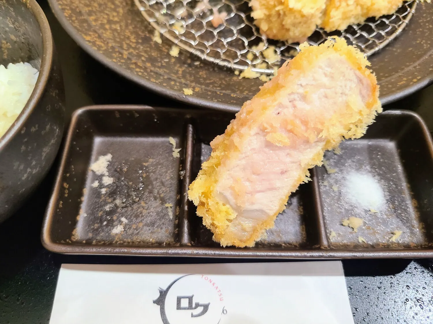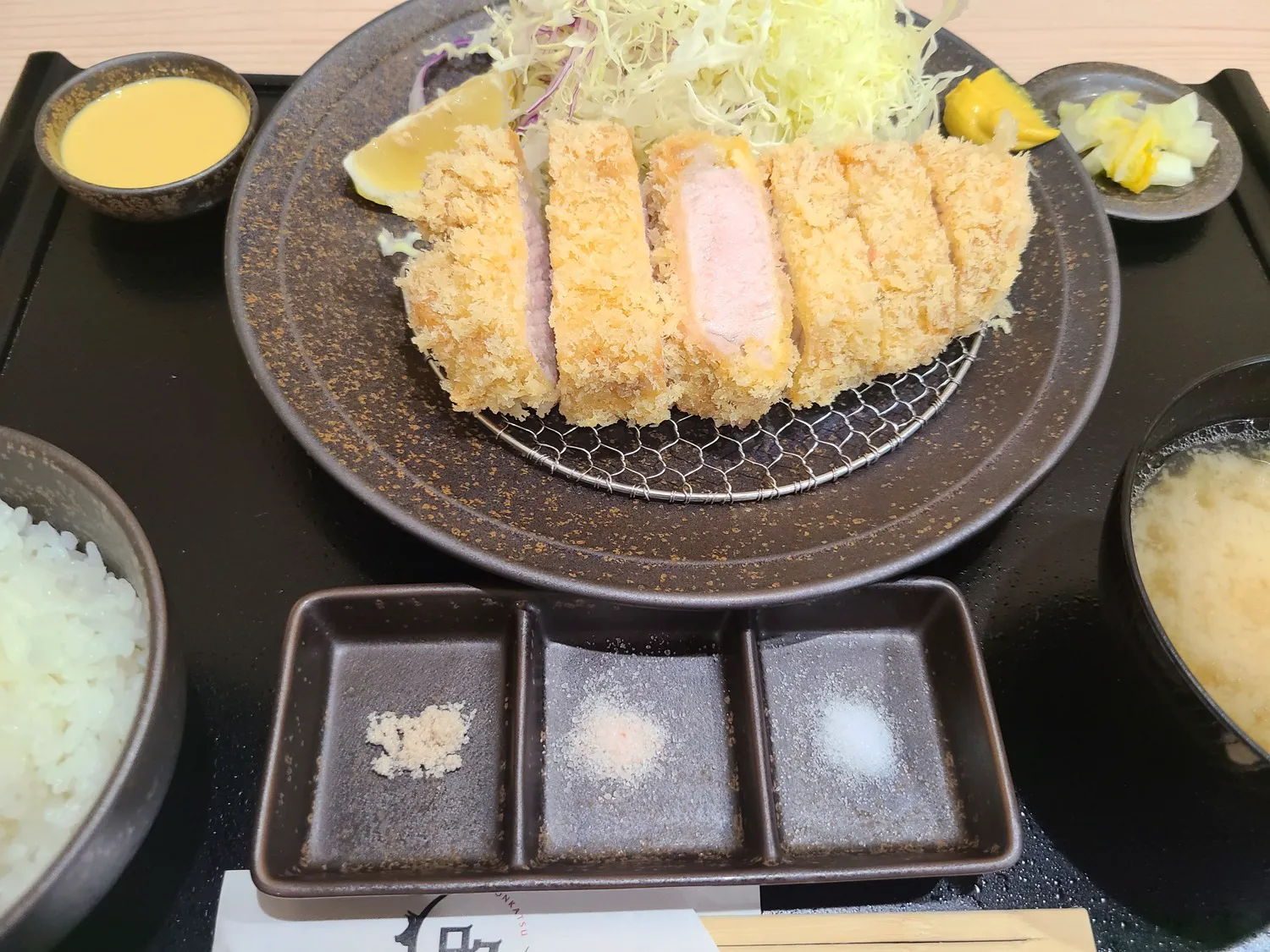モダンジャズが流れる店内でゆったりと、白くて柔らかいとんかつを味わえる【とんかつロク京急川崎店】。豚肉にこだわり、ハーブ三元豚、SPF「十和田湖高原ポーク桃豚」、幻の豚「Tokyo X」の3種類がセレクトされています。豚肉の種類に合わせて、揚げ方や調理法を変える徹底ぶり。低温調理で豚肉の旨みを逃さず、サクッとジューシーに仕上げてくれます。特にオススメは、なめらかな食感の『幻の豚「Tokyo X」リブロース 200g』や、あっさりとした『SPF「十和田湖高原ポーク桃豚」ヒレ、シャトーブリアン 160g』。3種類の塩やソース、醤油、オリーブオイルなど豊富な調味料が用意されているので、自分流で楽しめるのがうれしいところです。
