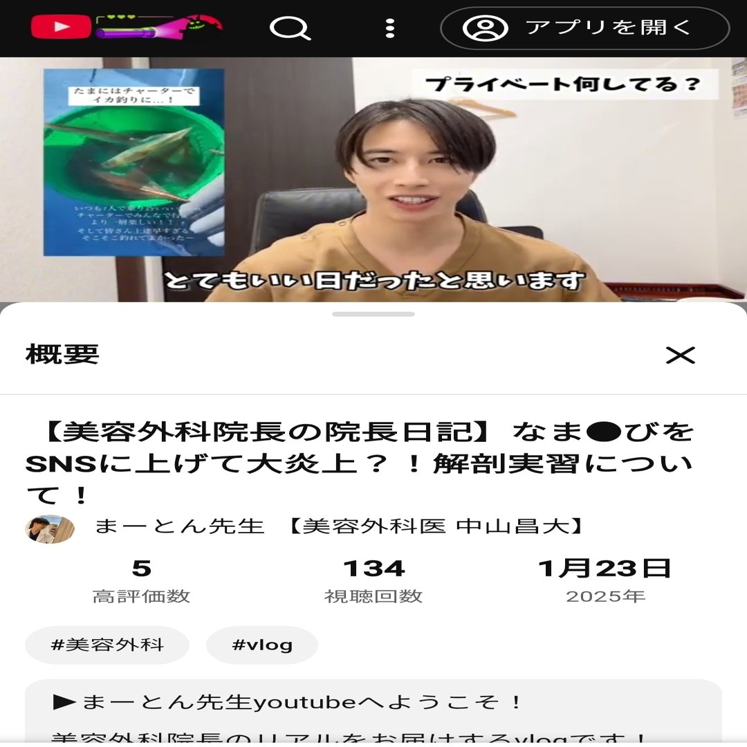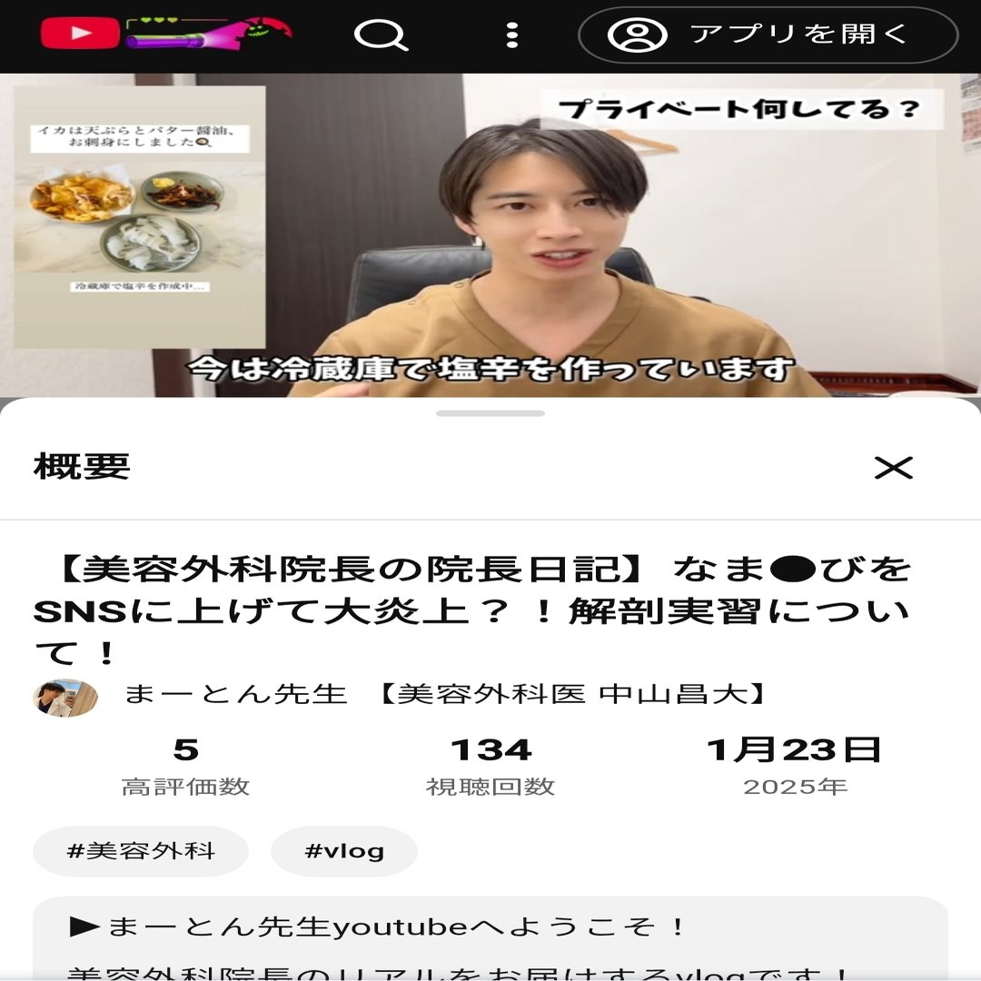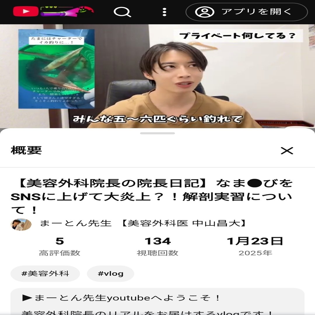 本題に戻って1:12の中山医師による「イカを捌く」発言に関して。ここでは趣味のイカ釣りのことに言及していて「捌く」の使い方には問題はないだろう。ただこの次の動画、1月28日にアップされた動画では「ドクター2人で(患者)を捌いていった」と述べている。YouTube視聴者がどの順序で動画を見るのかは不明だが、登録者はアップされるたびに動画を見るのではないだろうか?「イカを捌く」と言っていた次の動画で「患者を捌く」と発言すれば当然視聴者は「患者に対してイカと同じ【捌く】という動詞を使うのか?」と違和感を持たないだろうか?更には「患者を捌く」と発言した5日前の動画では黒田あいみさんが行った献体写真不適切インスタ投稿に触れているが、これでは言及した炎上事件からあまり何も学べていないと言えないだろうか?中山昌大さんは友達と釣りに行ったイカと同列に患者さんを捉えていて、釣ったイカを天ぷらやお刺身、塩辛にして食べるのと同じ感覚で患者さんに対して施術しているということだろうか?