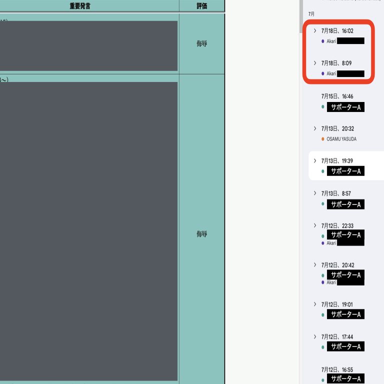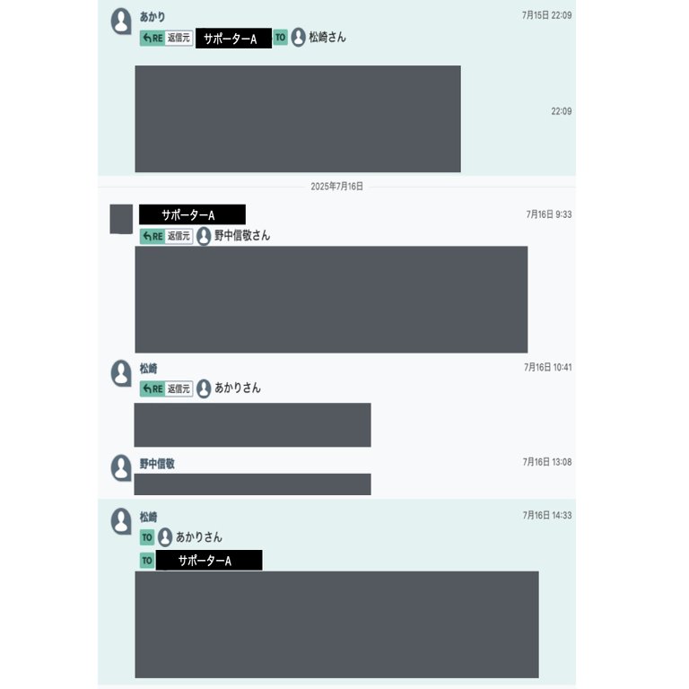(画像1:7/16日のチャットワークでのやり取り 画像2:サポーターAの作業履歴)
