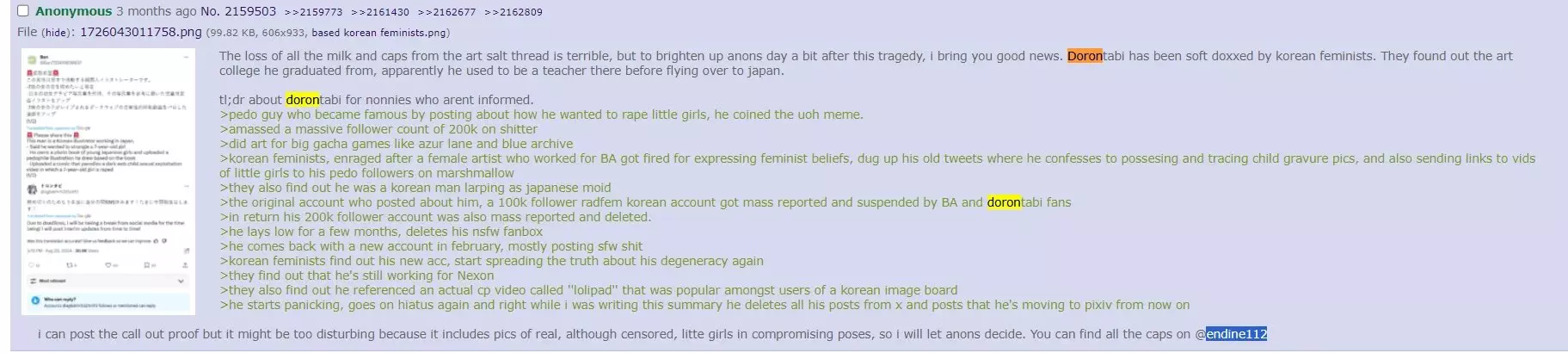 Dorontai, 도른타비- South Korean Illustrator LARPing as a Japanese person to avoid trouble. Worked Korean game company Nexon's game Blue_Archive, said on his Twitter account that he practices drawing by tracing over real Japanese children model magazines. He even referenced a real cp video called "lolipad". Deleted his twitter and ran once he was discovered. More info here