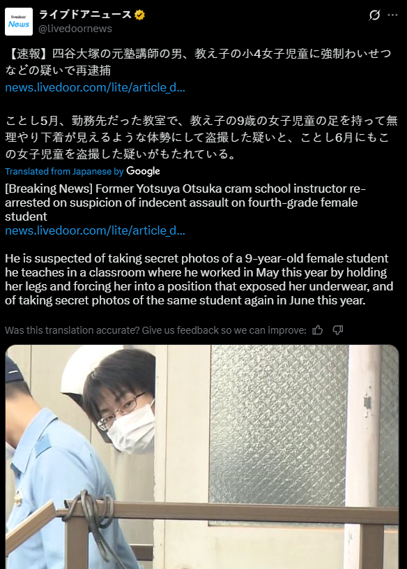 In September 2023, A Japanese man (X) (Name wasn't provided) who is an anti-feminist and a "freedom of fiction activist" who wrote lolicon novels was arrested for raping elementary school girls. He was a member of a 'lolicon-only chat group'. He shared personal details and photos of female students with members of his lolicon-only chat group. Most of the victims are elementary school students under the age of 10. He expressed that he wanted to gang rape his students (X)