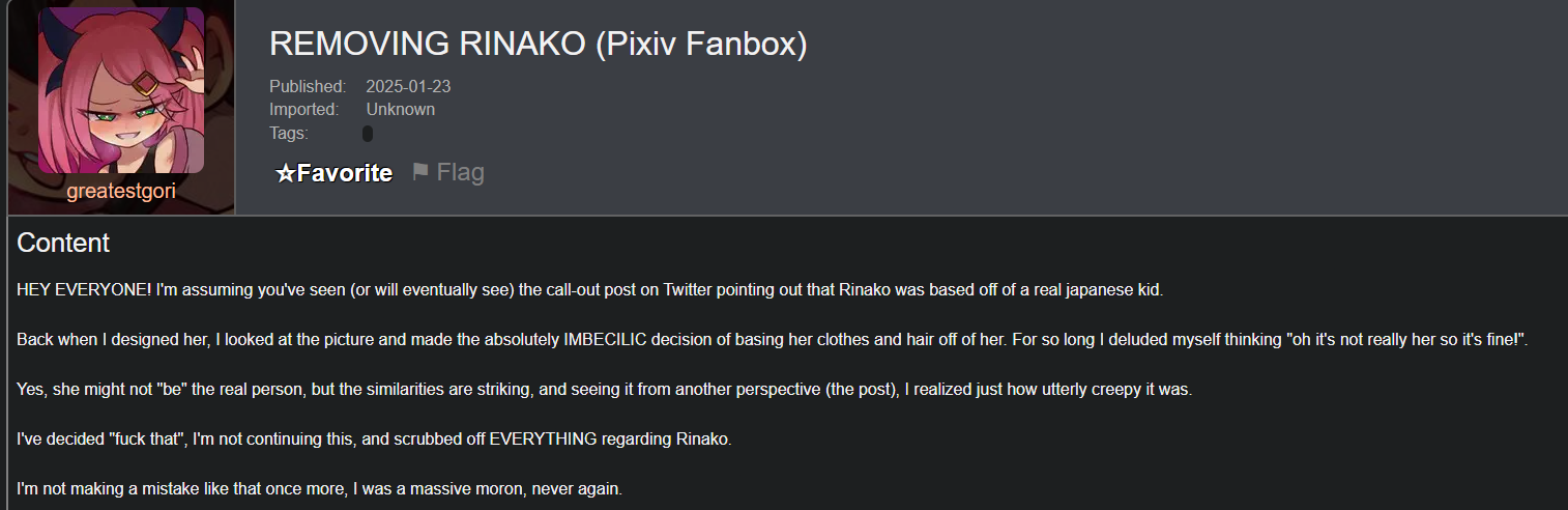 GreatestGori505-A porn artist that also does lolicon and made art based off a real picture of a japanese girl. The backlash on X was so bad within his gooner community that he removed the art.