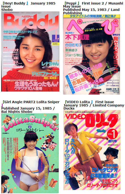 "Lolicon topics in 1984 were mostly related to the visual world, such as the successive release of Japanese lolita underground videos, such as "Cherry Killer," "Lolita Masayo," and "Shinobu, Third Year Junior High School Student," following "The Virgin Fountain" from the previous summer, the release of the Japanese version of "The Lolita Painful Rape," a real-life film of a 13-year-old girl that was banned in the United States, the distribution of uncensored underground versions, and the rise of lolita porn anime, such as the "Cream Lemon" series. Magazines were still being published, but perhaps they could not compete with the impact of a moving girl. Although I would like to write that this is still just a media story, "Hey!Buddy" magazine frequently published reports with photos of girl prostitution overseas, and the path to putting it into practice was already being steadily paved.