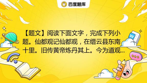 576 × 324 【题文】阅读下面文字,完成下列小题。仙都观记仙都观,在缙云县东南十里。旧传黄帝炼丹其上。今为道观。唐李阳冰为令时,书“黄帝祠宇”四大字,尚存 ... easylearn.baidu.com