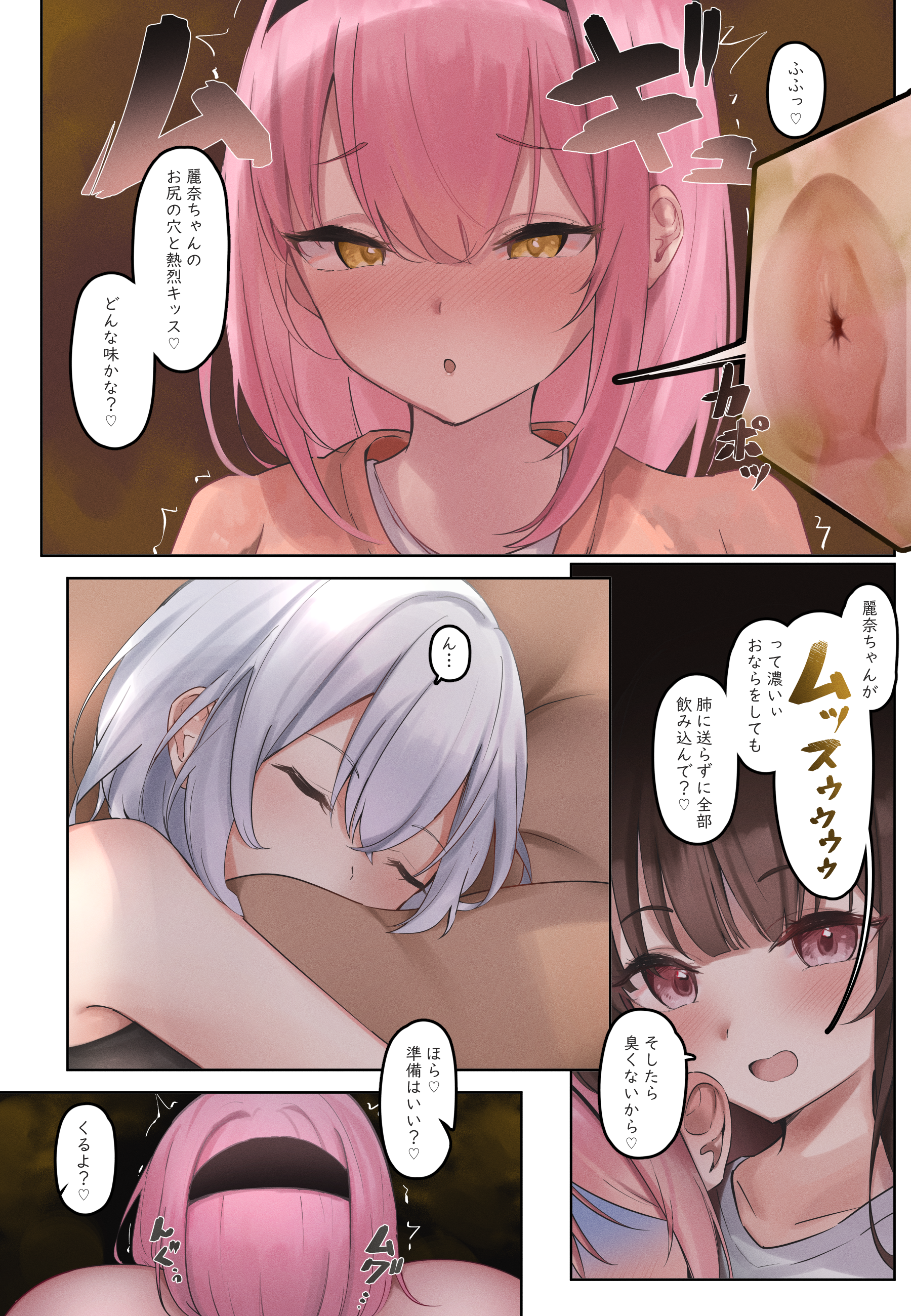Text for translation(翻訳用テキストです) 【1】 「私は今、ものすごく臭いニンニクっ屁を布団の中で嗅がされています。」「ん…」ブッズゥゥゥゥゥゥ!!「んぐッ!?ゴホッ…ケホッ…」 【2】 「ほら、頑張って吸わないと♡また無理やり鼻の穴くっ付けちゃうよ?」「む、無理ぃ…」「ありゃりゃ…そんなに嫌なら臭くない吸い方教えたげよっか?♡」「え…?」「え、ちょっ…」「ちょっとじっとしててね〜♡」「なにやって…むぐぅ!?」 【3】 「ふふっ♡麗奈ちゃんのお尻の穴と熱烈キッス♡どんな味かな?♡」「麗奈ちゃんがムッスゥゥゥゥって濃いぃおならをしても肺に送らずに全部飲み込んで?♡」「そしたら臭くないから♡」「ん…」「ほら♡準備はいい?♡来るよ?♡」 【4】 「うわっ♡気絶級だねこれ♡」「ほら♡頑張れ頑張れ♡」「鼻に入ると気絶しちゃうよ〜?♡」「よしよし♡全部飲み込めたね〜♡えらいえらい♡」「な、なんか息が…」「あ、そうだ♡」「喉とか胃の粘膜に臭いが染み付いて数日は息が臭いと思うけど頑張ってね〜♡」「今のおならだと1週間は食べたものがニンニクっ屁風味になっちゃうかも♡ふふっ♡」「この後も朝まで嗅がされ続け、鼻や喉にこびり付いた臭いは二週間以上落ちなかった。」