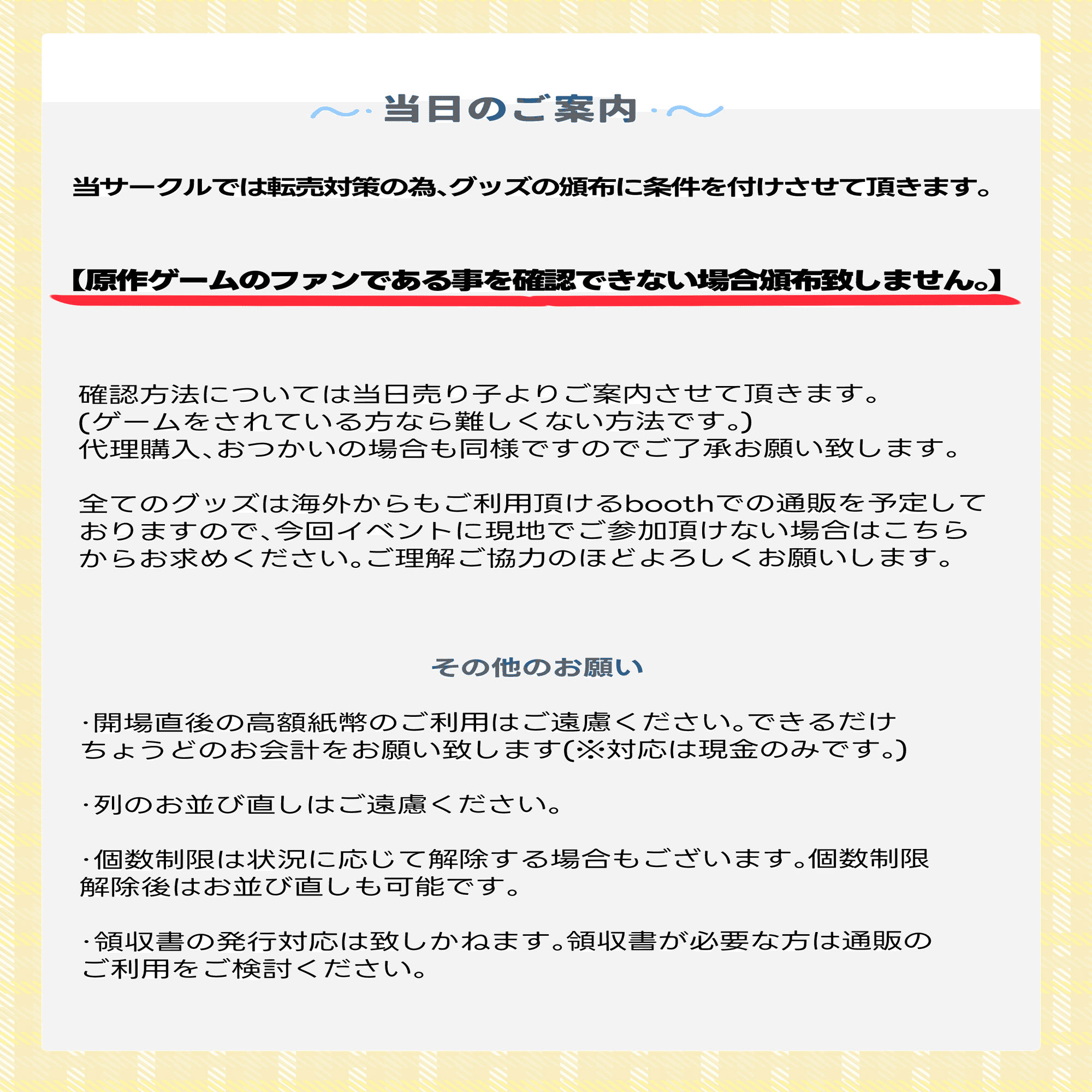 実際に全員に確認するかは置いておいて、ゲーム画面提示などの頒布条件を設けることで断る理由を作れますし、条件を書いた紙を置いておくだけでも魔除けとして転売目的の購入の防止に効果を発揮するはずです。