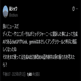 しかし結局のところ、ディズニーは「自社IPが他社によって学習・出力される」という状況が許せなかっただけであり、生成AIに否定的ではないのはもちろん、「みんな被害者、みんなで助かろう」の無断学習罪にも全く興味が無かったわけである。Disney+ Createがどのような生成AIであるにせよ、基盤技術が一切何も無断学習せずに作られた物とは到底考えられない。反AIはそれを一生「問題だ」と言い続けるだろうが、ディズニーは「問題ない」と考えている。