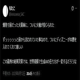 ディズニー社はこれまで一貫して生成AIに否定的な立場を取ってきた。2023年にUniversalと共同で画像生成AI「Midjourney」の開発元を著作権侵害で提訴し、2025年6月にはそこにWarner Bros.も加わった。結果として、ディズニーは反AIにとって「正義の味方」のようなポジションとなり、この世界に無断学習罪を誕生させる最大の希望として期待を集めていた。