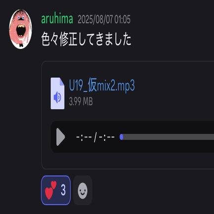音声の制作においては、主に私とあるひまさんで行いました。私が耳コピを行い、midiにしてあるひまさんに共有したのちに、音合わせをあるひまさんに行ってもらい、ドラムの打ち込みを私が行いました。