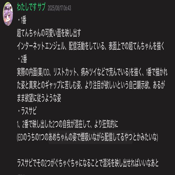 あめちゃんは配信外の姿、リアルの姿です。あめちゃんとしての姿、言動が彼女の本質であり、現実なのです。配信を行う際には、インターネットエンジェル「超てんちゃん」になる、もしくは演じることで、オタクたちからの愛を獲得しています。配信時とリアルでほぼ正反対と言ってもいい人格を持っているんですね。