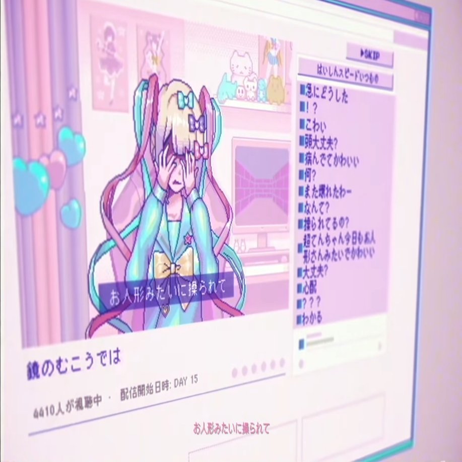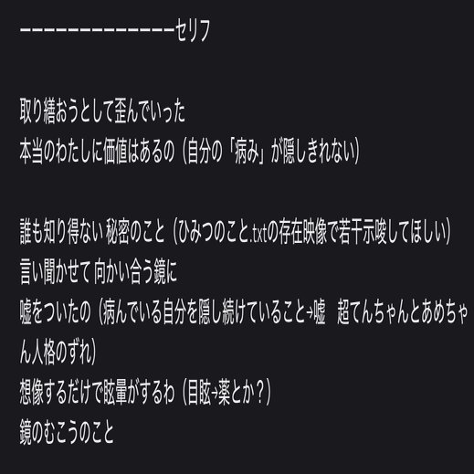 「言い聞かせて 向かい合う鏡に 嘘をついたの(病んでいる自分を隠し続けていること→嘘 超てんちゃんとあめちゃん人格のずれ)」