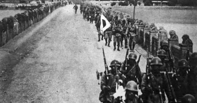 1937年7月の盧溝橋事件は、日本軍が数発の銃撃を受けたのが発端で、日本軍は約7時間応戦せず自重していたとされる。