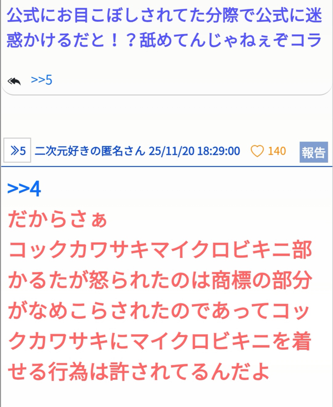 もっと笑いたいからコックカワサキマイクロビキニが原因でアカウント停止されたやつの姿が見たくてね - 131二次元好きの匿名さん25/11/20(木) 23:53:16