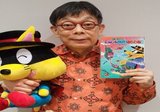 ポプラ社内にて。挿絵で作ったパネルの前で満面の笑みの矢部さん