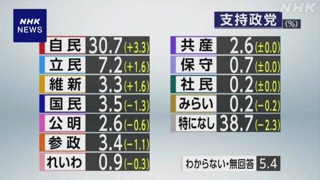 高市政権の支持率は高いのに… 自民党支持率は新内閣発足時としては石破以下、2012年政権復帰以来最低の30.7% 2025年11月13日 カテゴリ:自由民主党世論 2: それでも動く名無し 2025/11/11(火) 00:37:15.27 ID:WKRG9QKap 高市内閣発足時の自民党の政党支持率は30.7%でした。 調査方法が異なるため単純には比較はできないものの、2012年12月に自民党が政権復帰して以降、 内閣発足時の党の支持率は第2次安倍内閣では37.8%、菅内閣では40.8%、 岸田内閣では41.2%、石破内閣では35.1%で、高市内閣では、いずれの内閣よりも低い水準となっています。 https://news.web.nhk/senkyo/shijiritsu/ 引用元:https://nova.5ch.net/test/read.cgi/livegalileo/1762788995/ 【高市政権の支持率は高いのに… 自民党支持率は新内閣発足時としては石破以下、2012年政権復帰以来最低の30.7%】の続きを読む タグ :#NHK#世論調査#自民党#政党支持率#石破茂#高市早苗