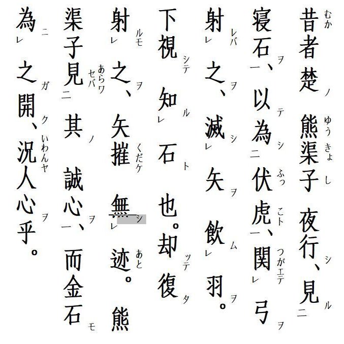 昔者(むかし)楚の熊渠子(ゆうきょし)夜行し、寝石を見、以て伏虎(ふっこ)と為し、弓を関(つが)えて之を射れば、矢を滅し羽を飲む。下視(かし)して石と知るなり。却って復た之を射るも、矢摧(くだ)け迹(あと)無し。熊渠子其の誠心を見(あら)わせば、金石も之が為に開く、況(いわん)や人心(じんしん)をや。