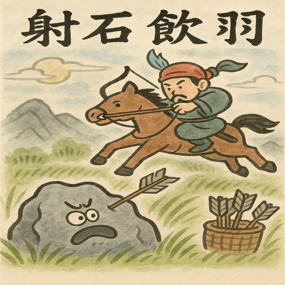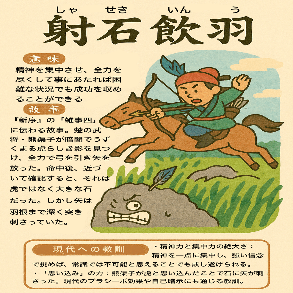 「射石飲羽」は、“物理的硬さ”を“精神的集中”が打ち破るという古典的比喩で、誠の力(まことの一念)が一回の臨界突破をもたらす、という思想史的含意をもつ。用いる際は、努力の量より心の質(専心・至誠)を強調する文脈が原義に即します。